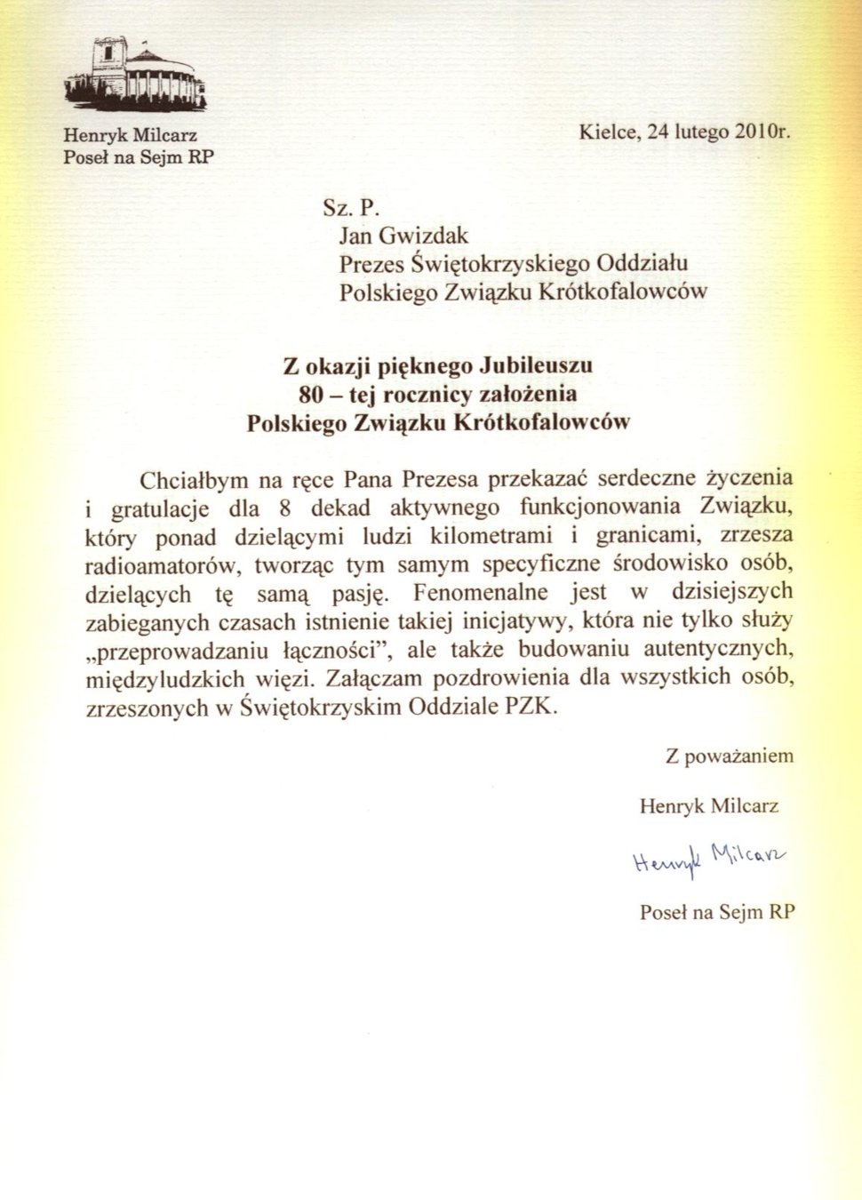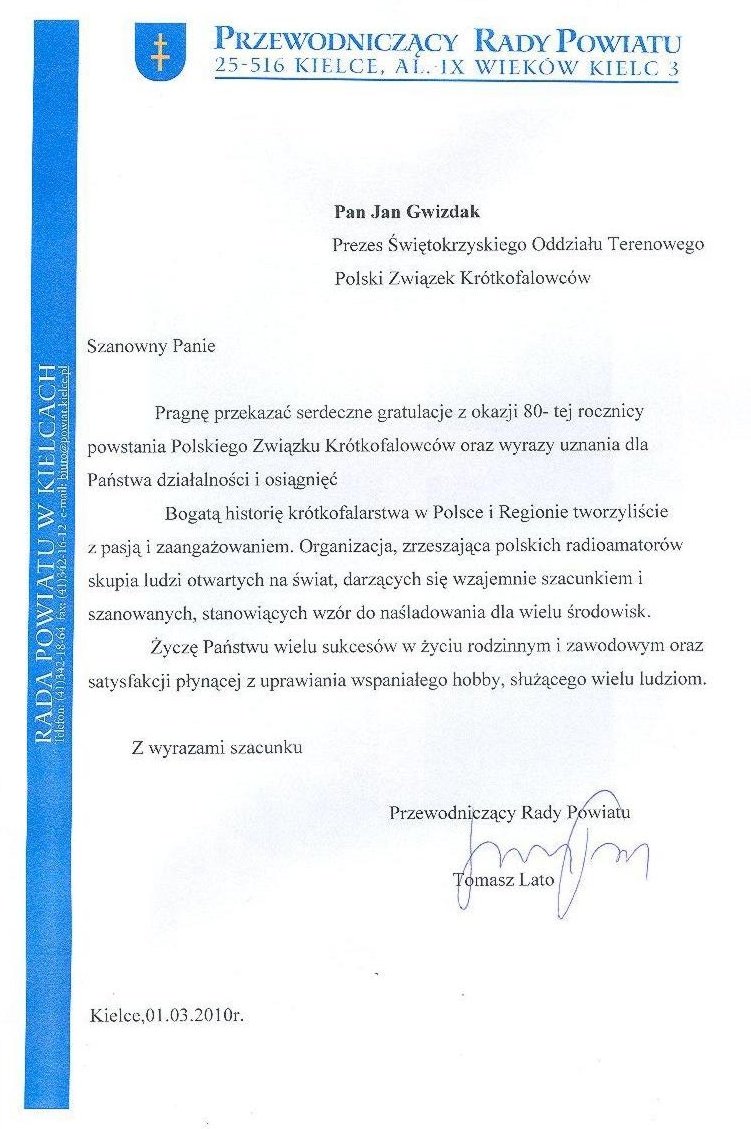 Jubileusz 80 lat PZK. Z okazji przypadającego dzisiaj jubileuszu 80 lat PZK otrzymaliśmy życzenia od Pana Henryka Milcarza Posła na Sejm RP, Pana Wojciecha Lubawskiego Prezydenta Miasta Kielce, Pani Bożentyny Pałki-Koruby Wojewody Świetokrzyskiej i Pana Tomasza Lato Przewodniczącego Rady Powiatu. W imieniu społeczności krótkofalarskiej serdecznie dziękujemy za pamięć i ciepłe słowa skierowane do naszego środowiska. Życzenia od Pana Henryka Milcarza Posła na Sejm RP Życzenia od Pana Wojciecha Lubawskiego Prezydenta Miasta Kielce Życzenia od Pani Bożentyny Pałki-Koruby Wojewody Świętokrzyskiej Życzenia od Pana Tomasza Lato Przewodniczącego Rady Powiatu » OPERATOR ROKU 2009 ŚWIĘTOKRZYSKIEGO OT PZK - SP7ASZ ANDRZEJ KOJER